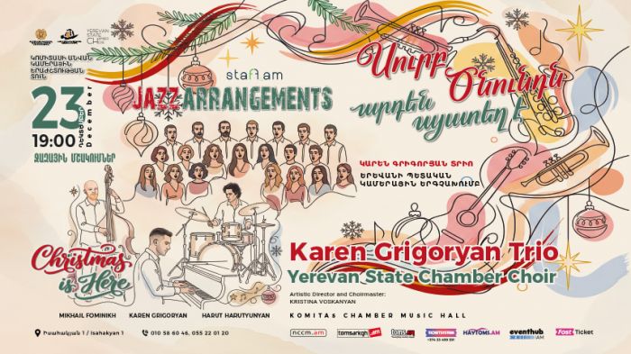 On December 23, at 19:00, the concert of Yerevan State Chamber Choir and Karen Grigoryan Trio entitled ''Christmas is here'' will take place at the Komitas Chamber Music Hall.