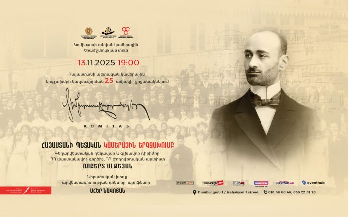 Նոյեմբերի 13-ին՝ ժամը 19:00-ին, Կոմիտասի անվան կամերային երաժշտության տանը կկայանա Հայաստանի պետական կամերային երգչախմբի «ԿՈՄԻՏԱՍ. խմբերգեր» խորագրով համերգը:
